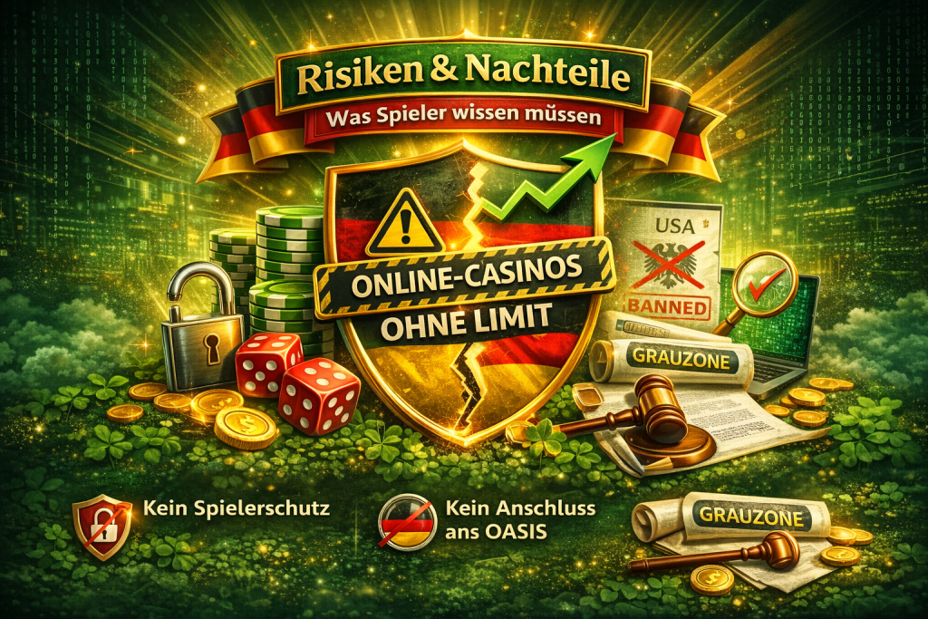 Ein Online Casino ohne Limit bietet deutschen Spielern klare Vorteile gegenüber dem stark regulierten deutschen Modell: freie Einsatzgestaltung, vollständiges Live-Casino-Angebot, attraktivere Bonusprogramme und keine automatische Spielsteuer. Gleichzeitig liegt die Verantwortung für einen kontrollierten Spielumgang vollständig beim Spieler selbst, da externe Schutzmechanismen wie LUGAS oder die automatische OASIS-Sperre nicht greifen.